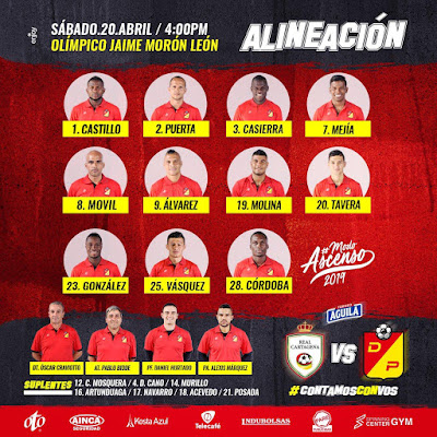 REAL CARTAGENA12 Wilder Mosquera; 13 Carlos Moreno, Elkin Mosquera, 14 John Lozano y 5 Elvis González17 Luis Sierra (C) y 19 Xavier González20 Robert Harrys, 11 Jhony Cano y 16 Jean Pineda; adelante, 7 Edwin Aguilar (Panameño).